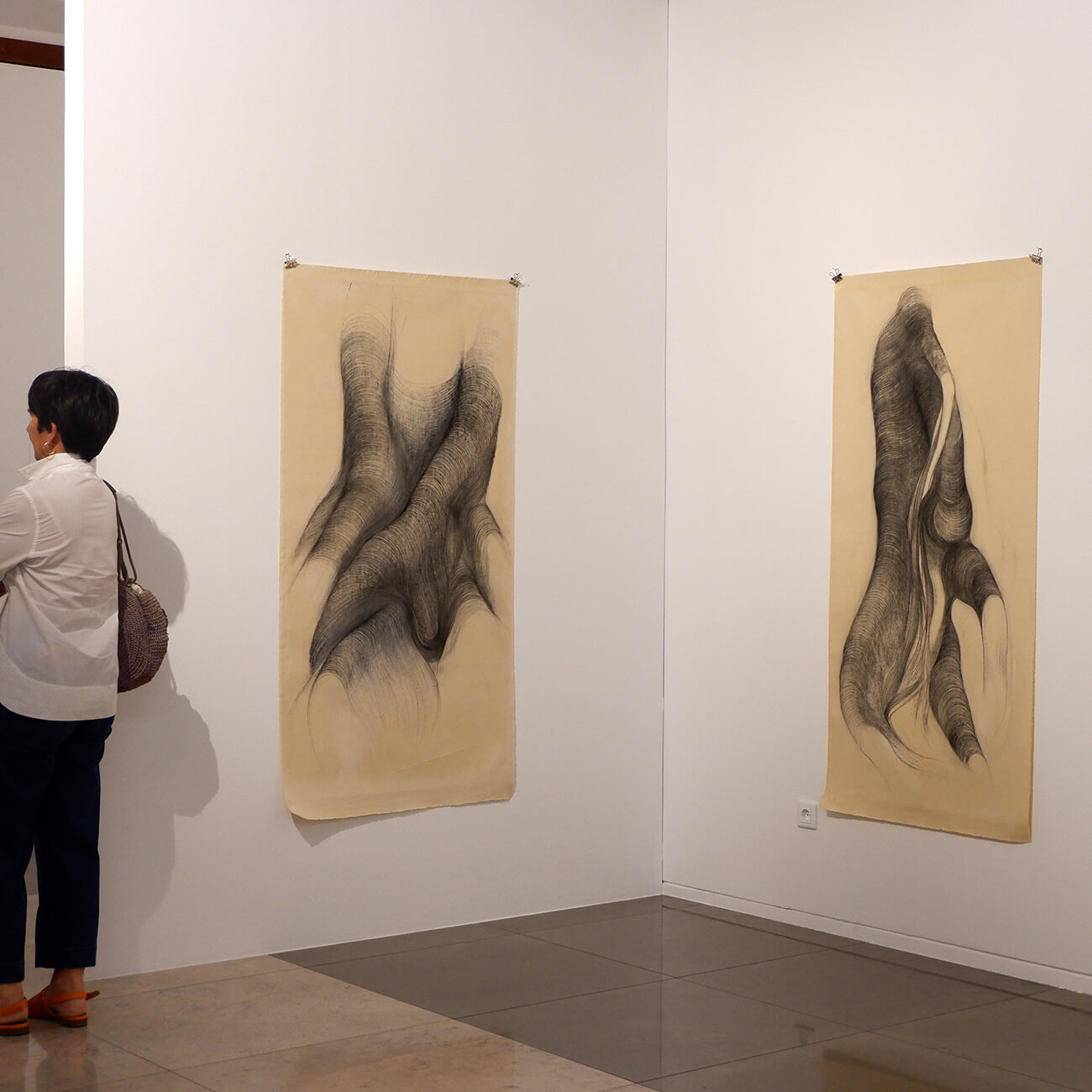 A artista plástica Christine Enrègle apresenta duas séries de desenhos a carvão sobre tela de algodão (cerca de 150 x 80 cm cada um), realizadas no âmbito de residências artísticas em Lisboa em 2021, a partir das Ficus macrophylla do Jardim Botânico da Ajuda e do Jardim Botânico de Lisboa.