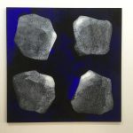 Excelente colorista, cativa-nos o seu azul magnético e profundo, as suas figuras eruditas, por vezes esburacadas e desgastadas, contidas num espaço fechado que nos absorve. Se por vezes essas formas obscurecem o campo, outras vezes–e uma vez truncadoesse campo-abrem elas outro espaço de circulação que se estende para lá do quadro. Passagens, deslocações (que imaginamos lentas) de massas que param, congelando-se em constelações. Os asteróides, enigmáticos, brincam em movimentos felinos no rugido inaudível do vazio sideral.